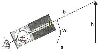 Hat man einen Neigungsmesser (z.B. Recta DP 6/65/10 Kompass) um den Winkel w zu ermitteln und kennt man die Entfernung a, kann man die Höhe h berechnen.